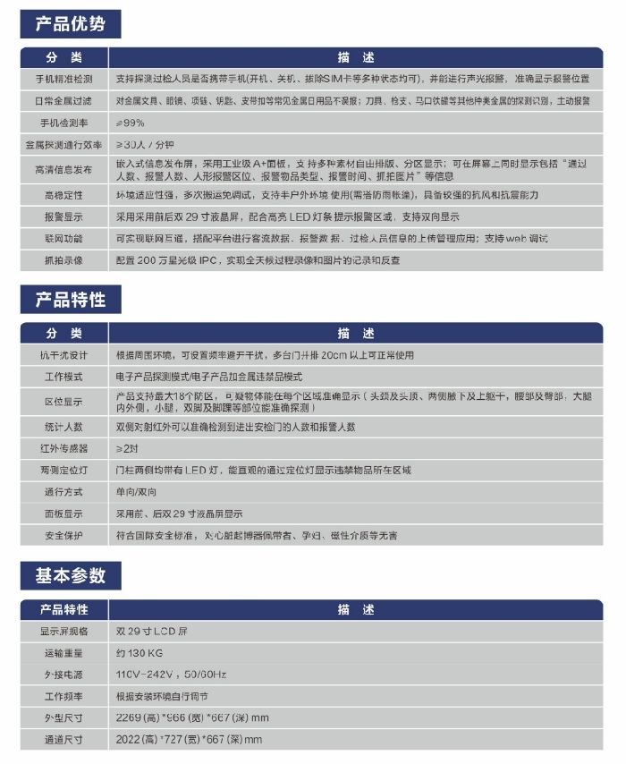 ZA-AM1629手機檢測門,可對手機進行分類檢測和聲光報警,并排除鑰匙、皮帶扣、眼鏡、首飾、各類文具等日常金屬用品不誤報;前后均采用29寸信息發(fā)布顯示屏,可實現(xiàn)圖片、音頻、視頻、字幕、實時畫面等不同素材的靈活播故;支持過程錄像和抓拍,實現(xiàn)歷史記錄反查;并針對性加強抗鳳和震動等干擾的能力。