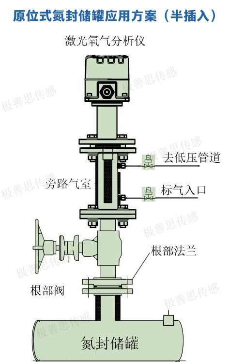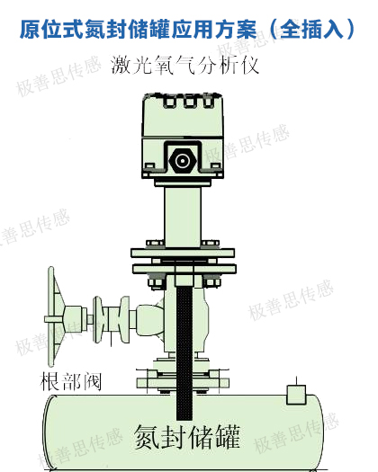 如圖所示,在氮封罐的根部法蘭上安裝一個(gè)根部閥,然后將激光氧氣分析儀直接插入儲(chǔ)罐安裝。該方式將鏡面有自限溫保溫功能,鏡面自恒溫在60℃左右,防止在鏡面上凝露。如有儲(chǔ)罐有負(fù)壓狀態(tài),可獨(dú)立選裝壓力傳感器,或者用戶測(cè)量的壓力信號(hào),以 4~20mA的形式輸入分析儀,進(jìn)行壓力補(bǔ)償。
